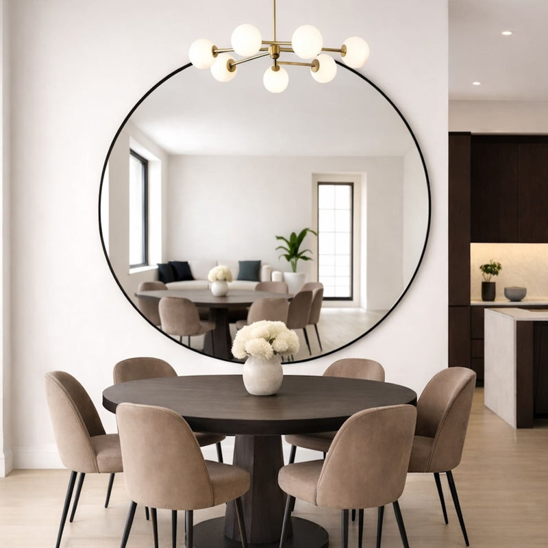 The Rei 150cm round format delivers dramatic visual impact in expansive living areas, positioned above sideboards, or strategically placed near patio doors where light amplification is essential. The mirror's substantial presence helps soften harsh architectural lines while adding visual cohesion to contemporary layouts and reflecting natural light throughout the space.