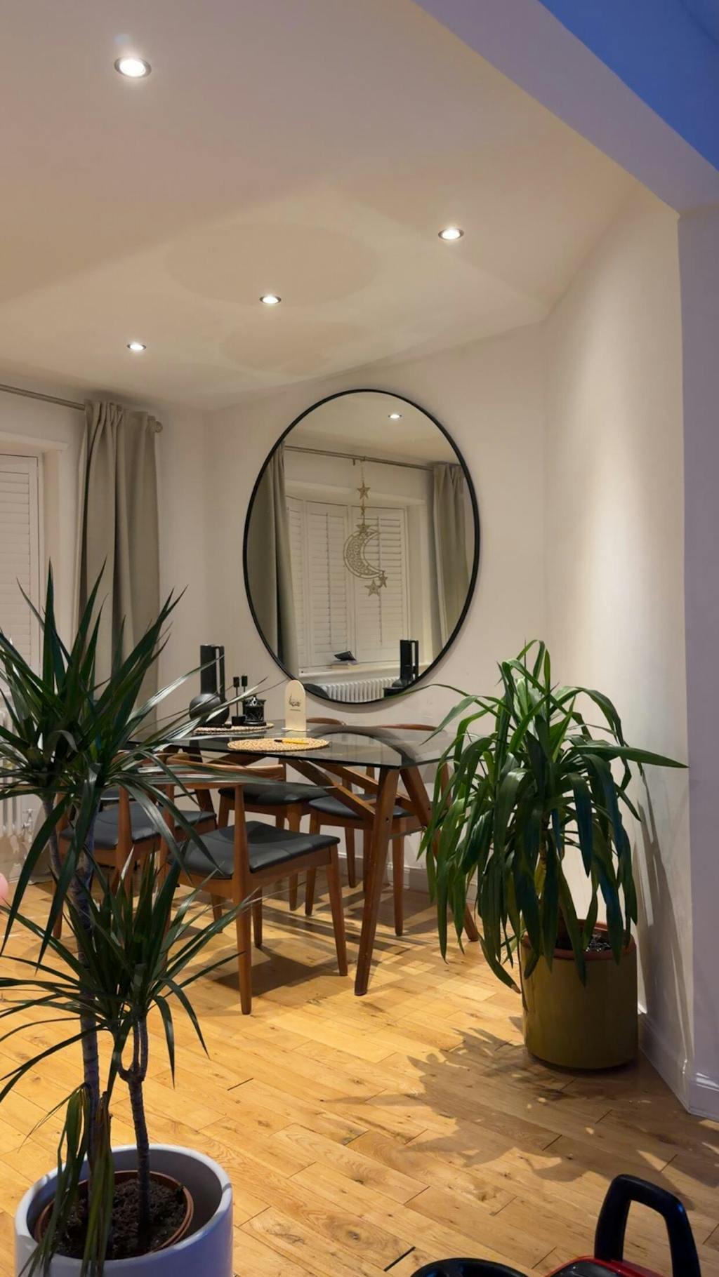 Positioned leaning or wall-mounted near doorways, this black round mirror creates a striking yet refined welcome statement. Its 150cm diameter provides impressive scale that complements standard door heights, offering perfect symmetry while reflecting natural light and creating the illusion of expanded space in narrow corridors.